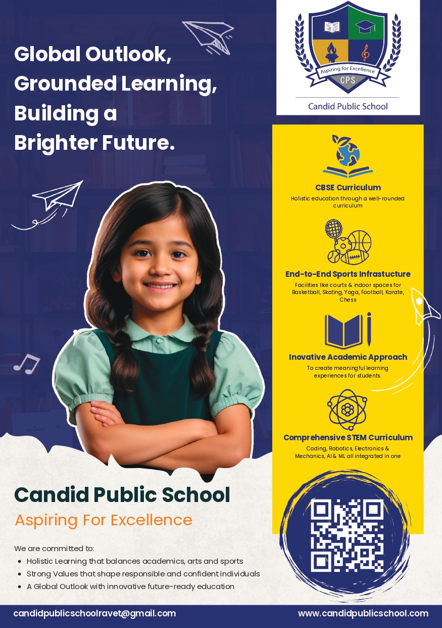Candid Public School is committed to providing a holistic and future-ready education with a global outlook and grounded learning that helps build a brighter future for every child. Following the CBSE curriculum, the school offers a well-rounded academic program supported by an innovative teaching approach that creates meaningful learning experiences. Students benefit from comprehensive STEM education integrating coding, robotics, electronics, mechanics, AI, and ML, along with end-to-end sports infrastructure that includes facilities for basketball, skating, yoga, football, karate, and chess. With a strong focus on values, academics, arts, and sports, Candid Public School aspires for excellence by nurturing confident, responsible, and well-balanced individuals.